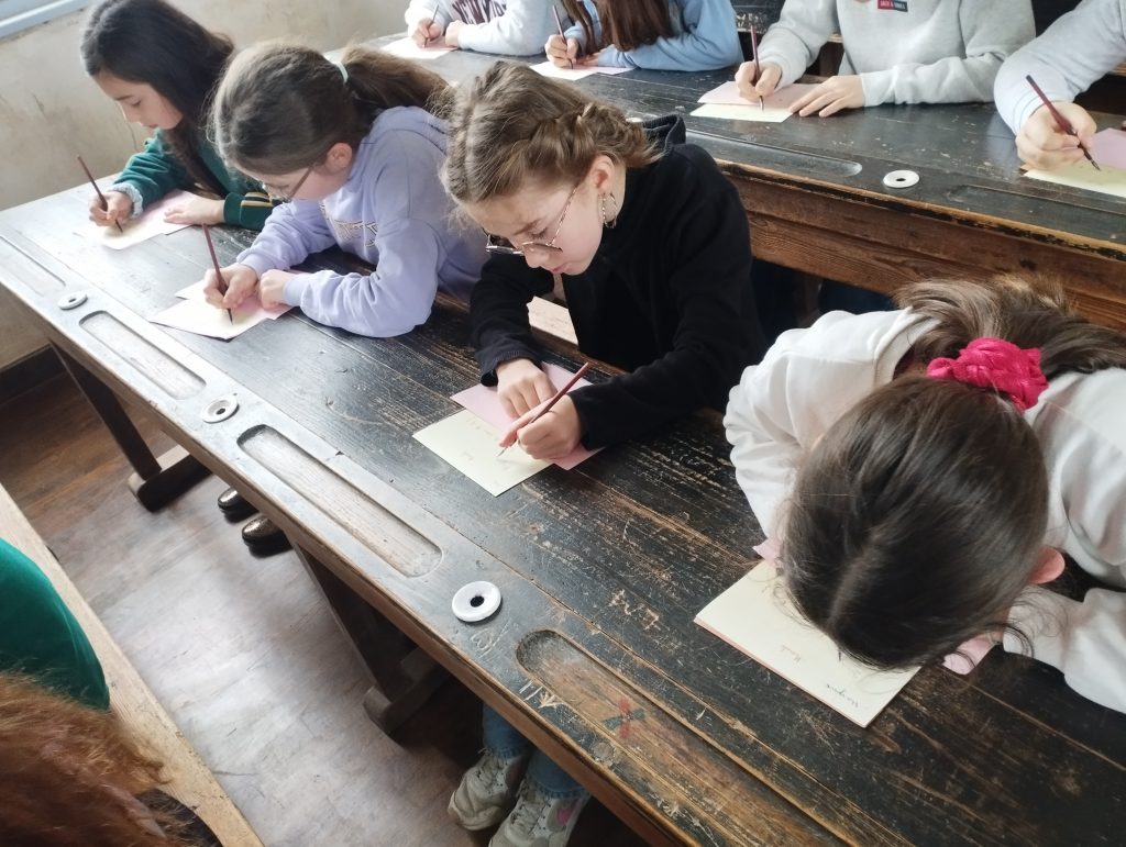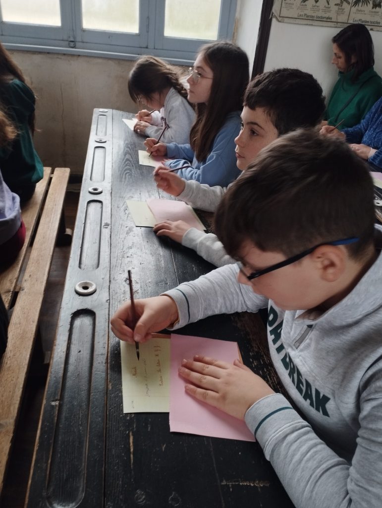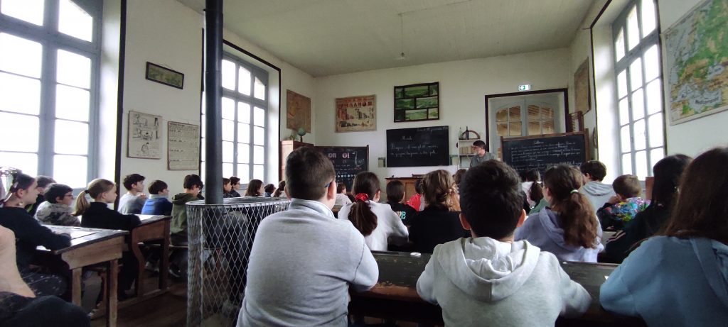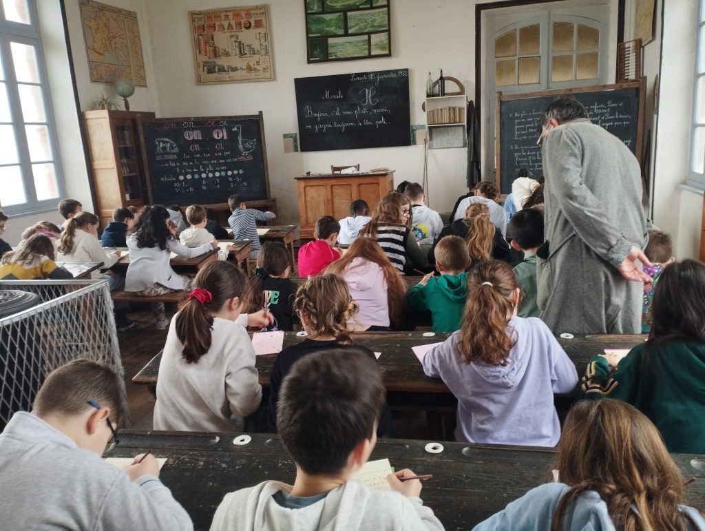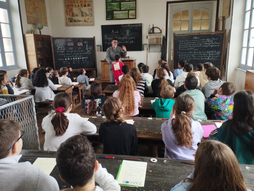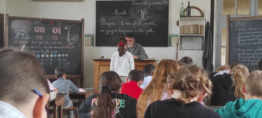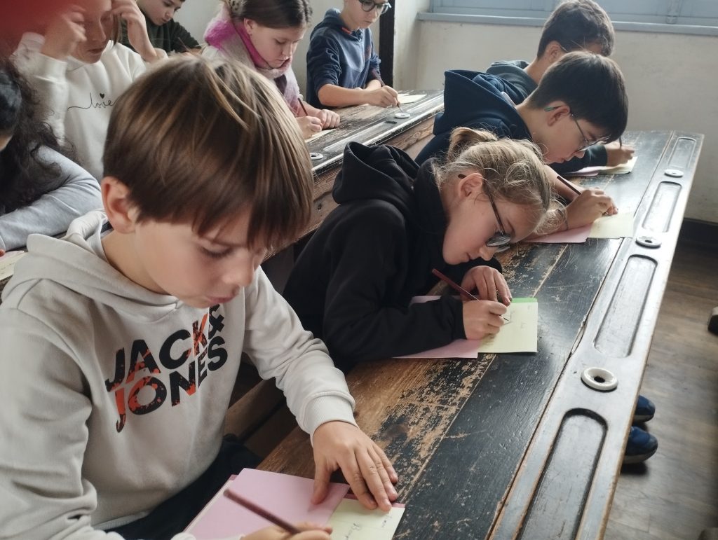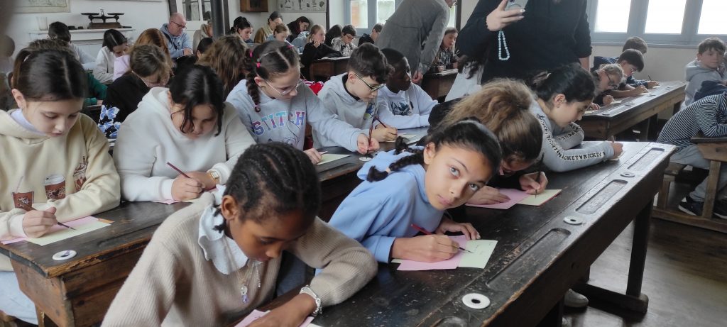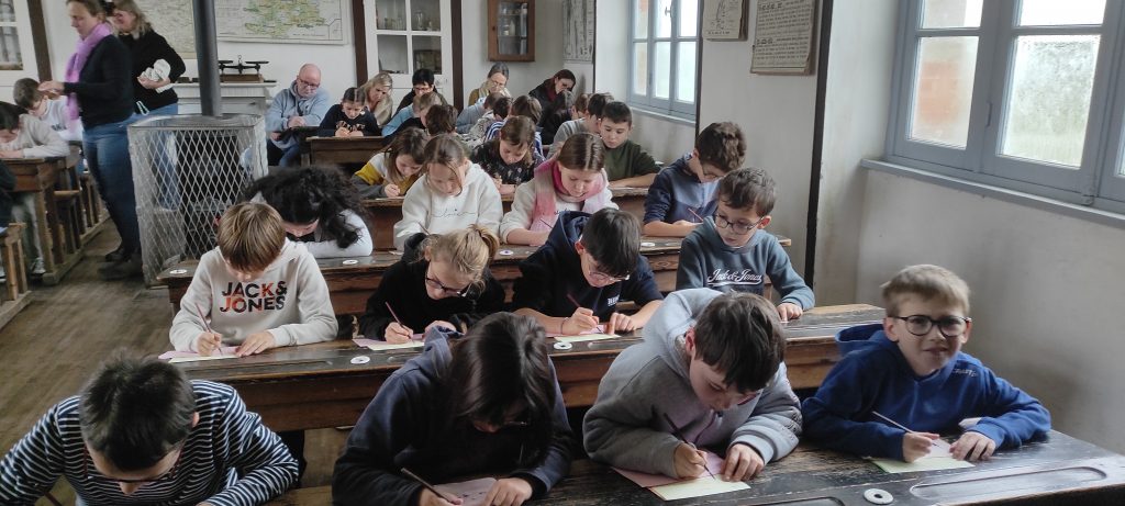 Dès leur arrivée, les élèves ont été plongés dans l’ambiance de l’école d’autrefois avec la mise en rang, comme cela se faisait à l’époque. Ils ont ensuite découvert une salle de classe fidèle à celles du passé, chauffée par un poêle, et se sont essayés à l’écriture au porte-plume. Chacun a copié une morale, prenant conscience de la patience et de l’application nécessaires pour écrire sans faire de tâche.