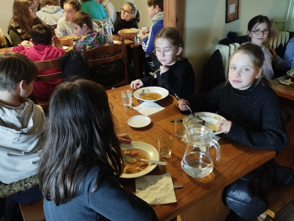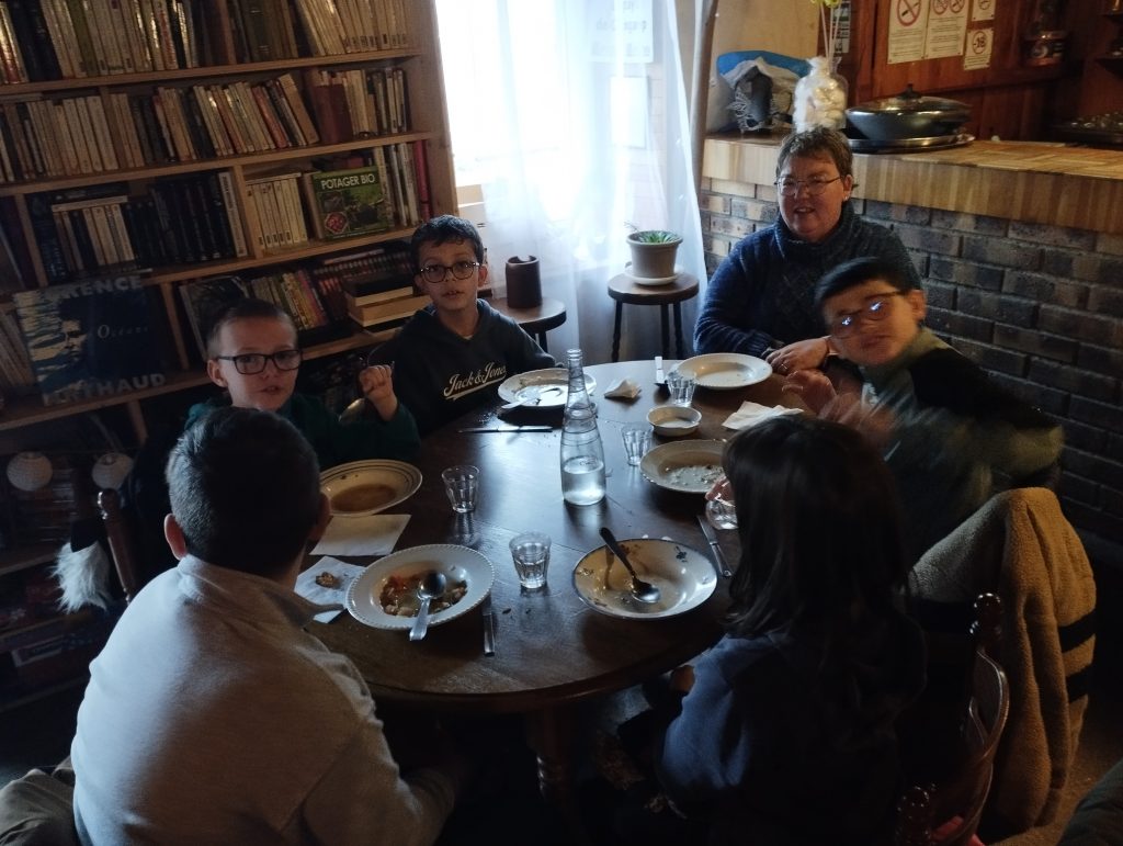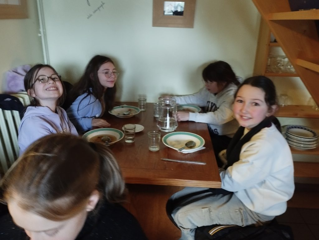 À l’heure du déjeuner, les élèves ont partagé un repas inspiré de celui des écoliers d’autrefois : une soupe de légumes accompagnée de pain. Pour le dessert, une petite entorse au régime d’antan a été faite avec une crêpe sucrée, très appréciée de tous.